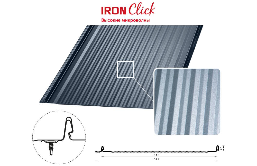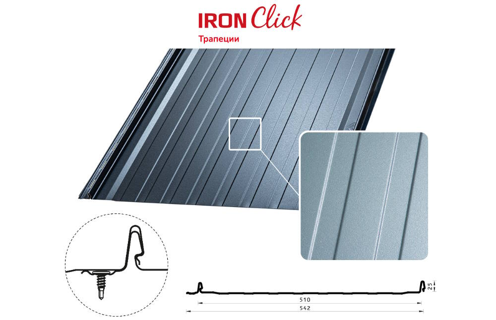 Специально для линии фальцевых панелей IRON мы разработали новый усиленный замок, который обеспечивает более точные и прочные продольные соединения. Инновационное профилирование замка делает кромку верхнего замка скрытой, что значительно улучшает эстетические свойства кровли.